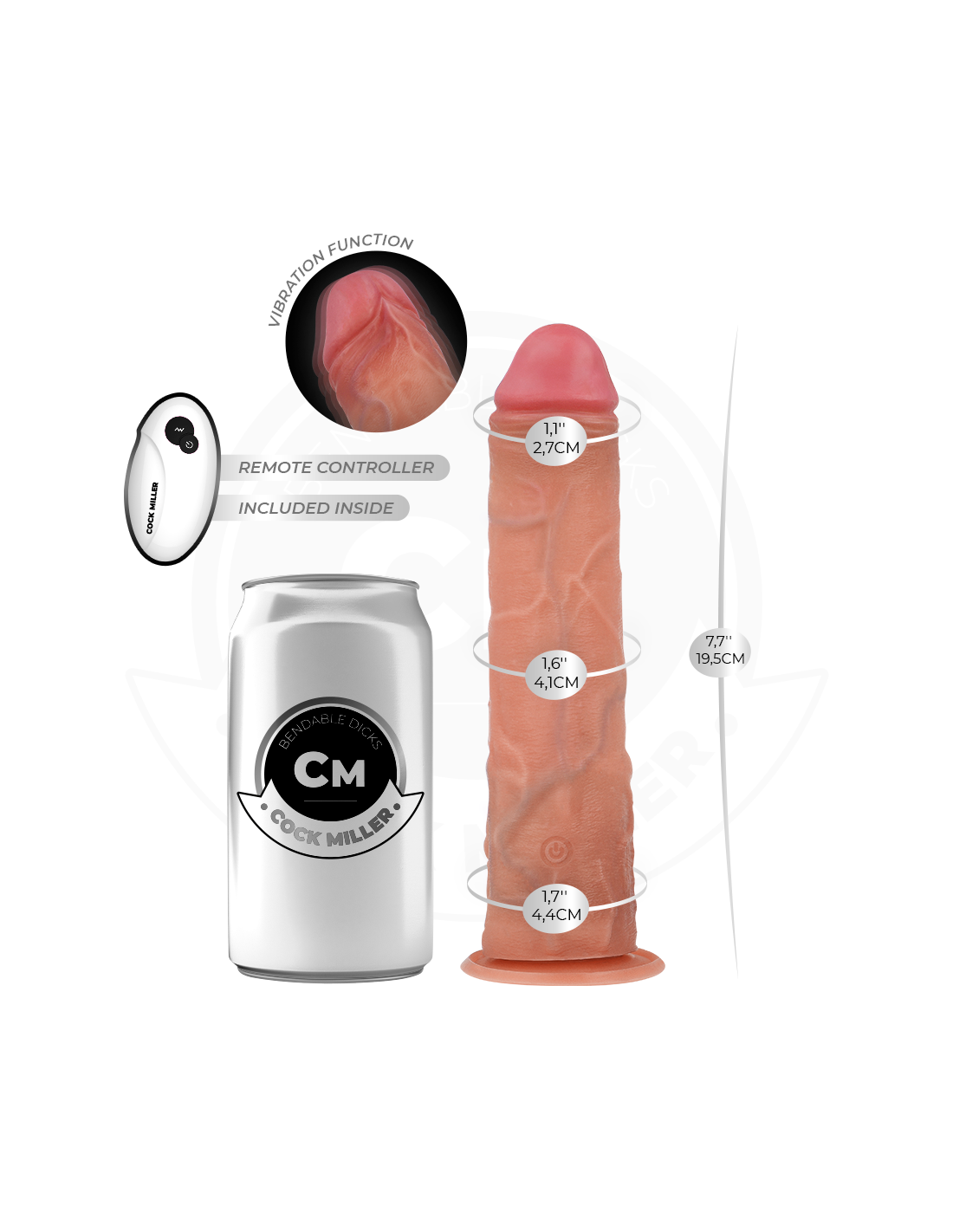 COCK MILLER - REALISTINIS DILDO SU SIURTUKU IR NUOTOLINIO VALDYMO PULTU, VIBRACIJOS 19,5 CM