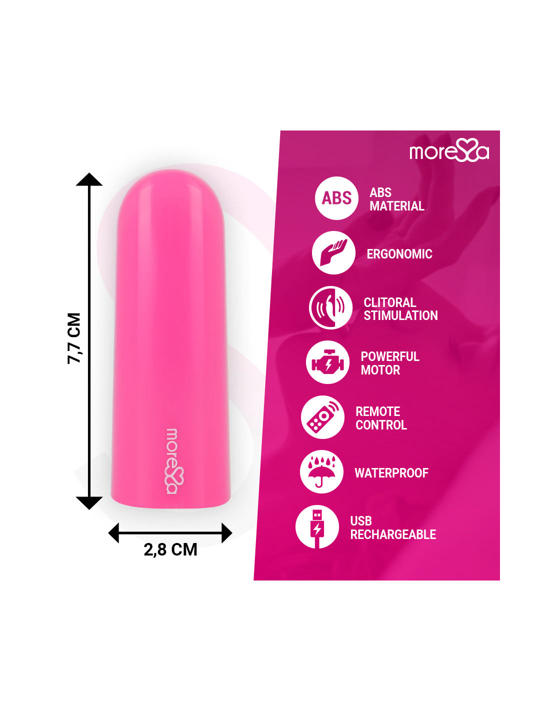 „Moressa“ yra etalonas savo dizainu, kokybe ir technologijomis. Sukūrėme novatorišką produktą ir pasirūpinome kiekvienu gamybos procesu, kad pasiektume geriausią rezultatą. „Moressa“ yra energijos, stiprybės ir garantijos simbolis. Įsigydami sekso žaisliuką „Moressa“, jaučiatės atspindėti šiandienos naujienose. Kiekvienas „Moressa“ žaisliukas nukels jus į skirtingus pojūčius. Neprilygstamas rezultatas dėka patogaus aukščiausios kokybės silikono ir ergonomiško dizaino.