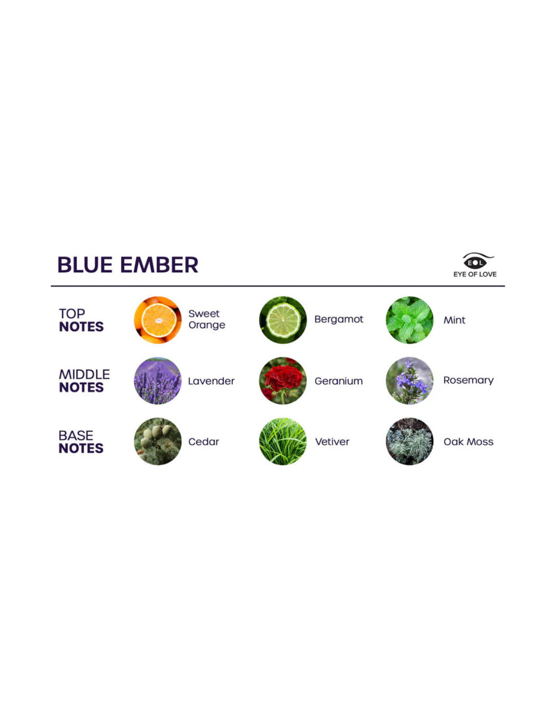- Natos : apelsinas, mėta, bergamotė, rozmarinas, pelargonija, kedras, vetiverija, ąžuolo samanos, levanda.