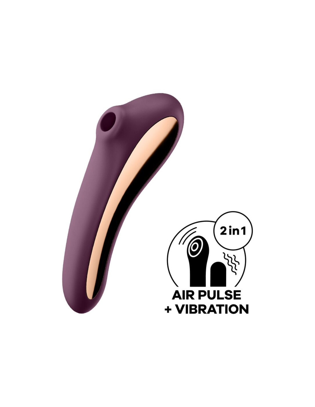 „Satisfyer Dual Kiss“ gali tiek daug: iš kūnui draugiško silikono pagamintas oro pulsuojantis vibratorius taip pat gali būti naudojamas kaip G taško vibratorius, kad patenkintų visus jūsų troškimus. Apvali tepimo galvutė gali stimuliuoti jus klitoriu jautriomis, pulsuojančiomis slėgio bangomis arba galite mėgautis stimuliuojančiu G taško masažu šiek tiek išlenktu, vibruojančiu koteliu. Jis taip pat tikrai patraukia akį dėl savo rafinuotos išvaizdos ir elegantiškų metalinių detalių!