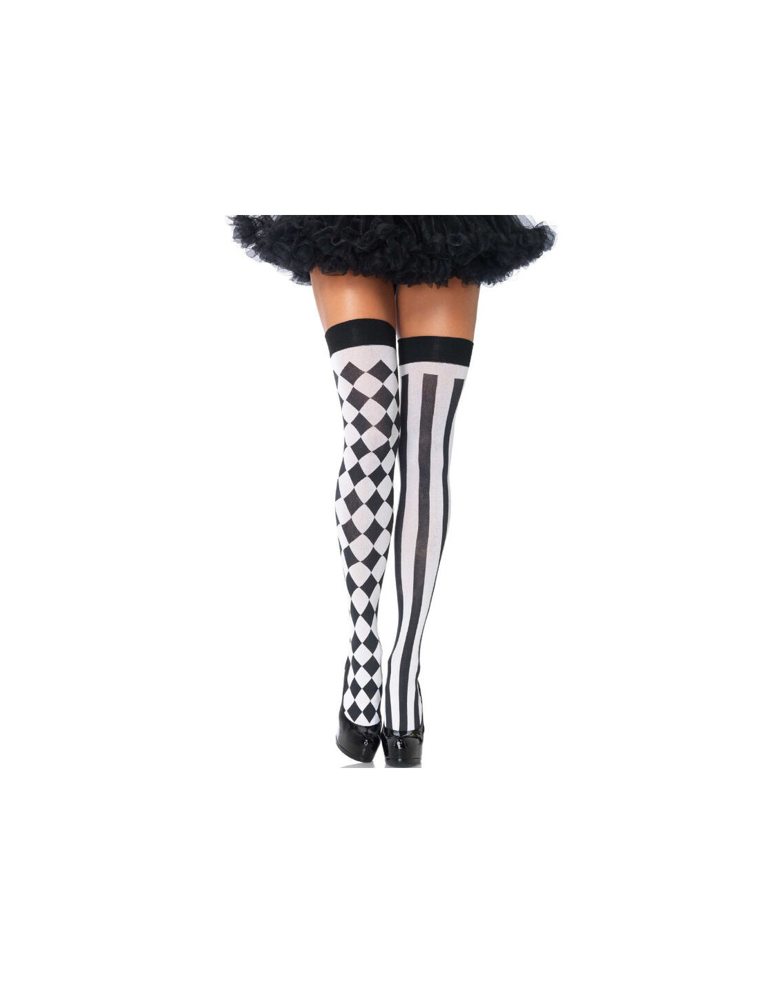 Juodai baltos iki šlaunų siekiančios arlekino pėdkelnės yra ryškus ir akį traukiantis pasirinkimas toms, kurios nori savo garderobui suteikti drąsaus, teatrališko akcento. Šis unikalus dizainas sujungia baltos spalvos eleganciją ir juodos spalvos rafinuotumą rombo raštu, kuris primena tradicinio arlekino kostiumo estetiką.