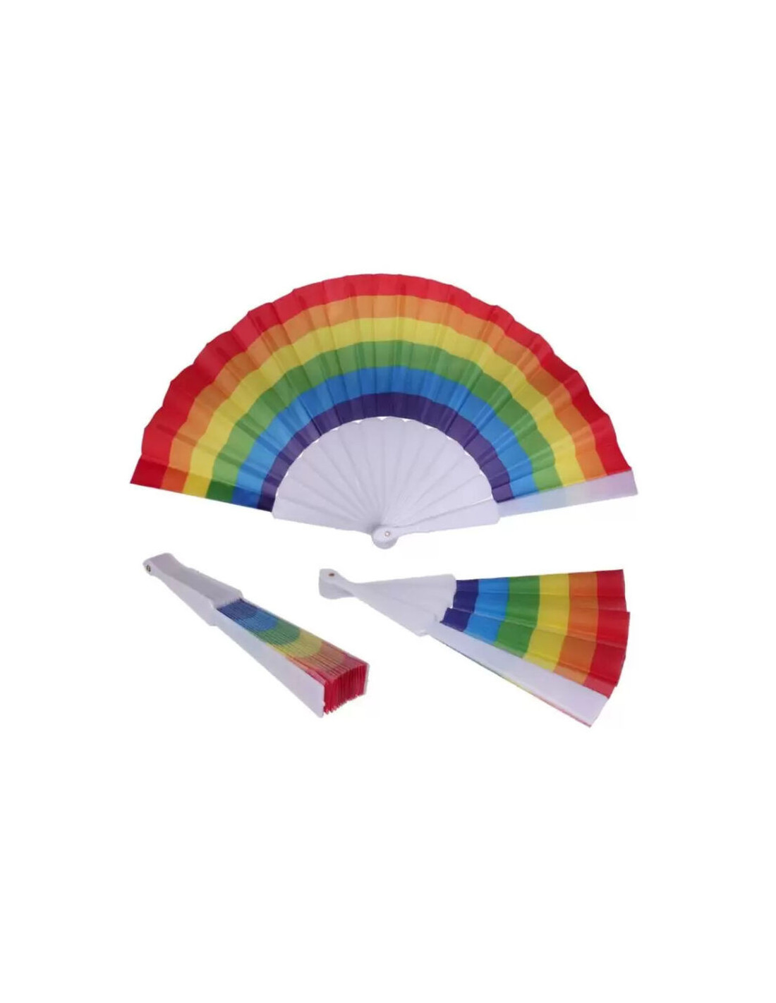 Plastikinis vėduoklis su medžiagine LGBT pasididžiavimo vėliava, sudarančia vaivorykštės formą.