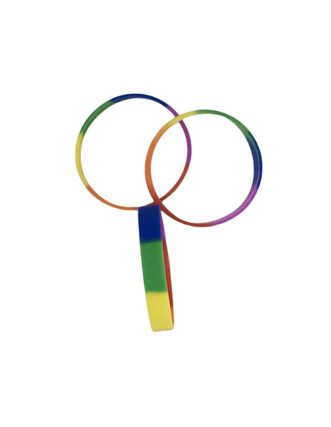 Elastinė silikoninė apyrankė su embleminėmis LGBT vėliavos spalvomis. Prisitaiko prie bet kokio dydžio. Dėl intensyvių spalvų ji tikrai traukia akį ir puikiai išsiskiria ant riešo.