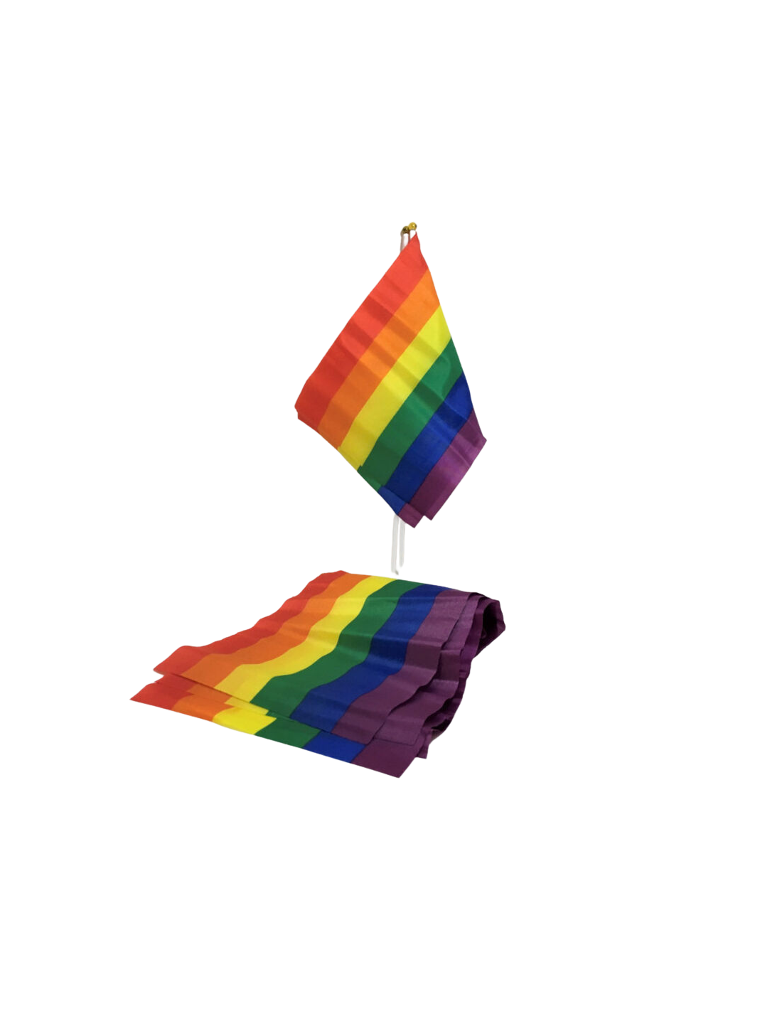 Maža vimpelinė vėliavėlė su gėjų pasididžiavimo spalvomis, kurios audinio matmenys – 20 cm pločio x 15 cm aukščio, pritvirtinta prie 30 cm ilgio lazdelės.