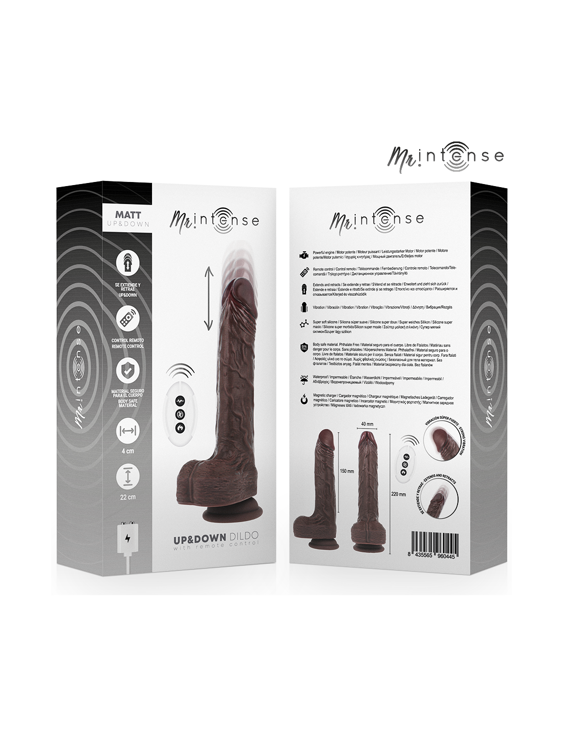 MR. INTENSE HIGH TECHLeiskite sau pasinerti į intensyvią ir realistišką patirtį su MATT, žvaigždiniu dildo iš MR „INTENSE“ kolekcijos. Sukurtas galingo ir gilaus malonumo mėgėjams, šis realistiškas vibratorius derina hiperrealistišką estetiką su vidine mechanika, kuri imituoja natūralų vertikalaus stumimo (aukštyn ir žemyn) judesį, kad suteiktų visiškai įtraukiančias sensacijas. Su lanksčiu 22 cm ilgio ir 15 cm įterpiamu kotu bei vidutiniu 4 cm skersmeniu, MATT siūlo tvirtą ir patenkinamą buvimą, nepažeidžiant komforto. Jo korpusas padengtas super minkštu, aukštos kokybės, kūno saugiu silikonu, kuris yra šilkinis ir imituoja tikrą odą.