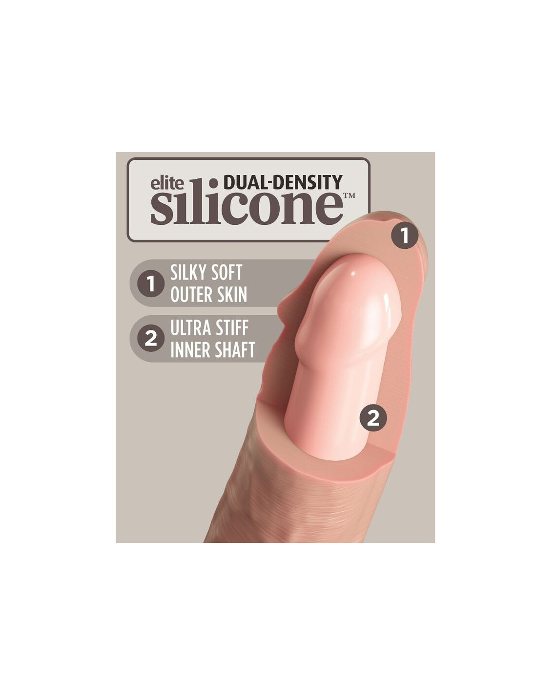 KING COCKŠis „King Cock Elite“ silikoninis dildas pagamintas iš aukštos kokybės dvigubo tankio „Elite“ silikono, todėl viduje jis standus, o išorėje minkštas.