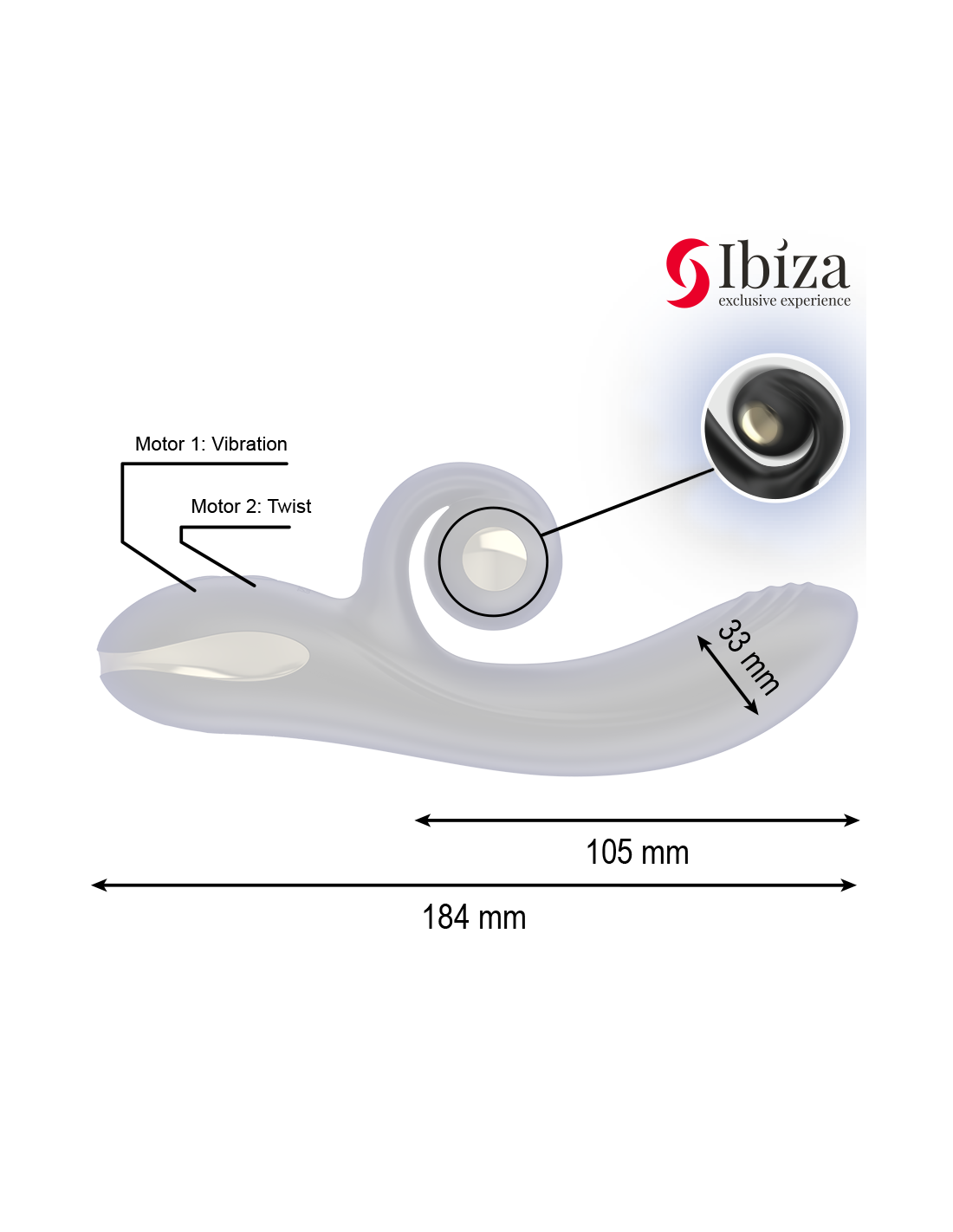 IBIZA TECHNOLOGYSu „IBIZA Twister“ besisukančiu dviejų variklių vibratoriumi patirsite unikalią ir neprilygstamą malonumo patirtį. Sukurtas tiems, kurie siekia visapusiškos ir intensyvios stimuliacijos, šis vibratorius sujungia dviejų variklių galią su sukimosi funkcija, kuri pakelia patirtį į visiškai naują lygį. Turėdamas 10 vibracijos režimų ir 10 sukimosi greičių, galite pritaikyti kiekvieną malonumo seansą pagal savo giliausius troškimus. Be to, ergonomiškas, vandeniui atsparus dizainas paverčia jį idealiu kompanionu tyrinėjant malonumą, nesvarbu, ar patogiai įsitaisę lovoje, ar mėgaudamiesi atpalaiduojančia vonia.