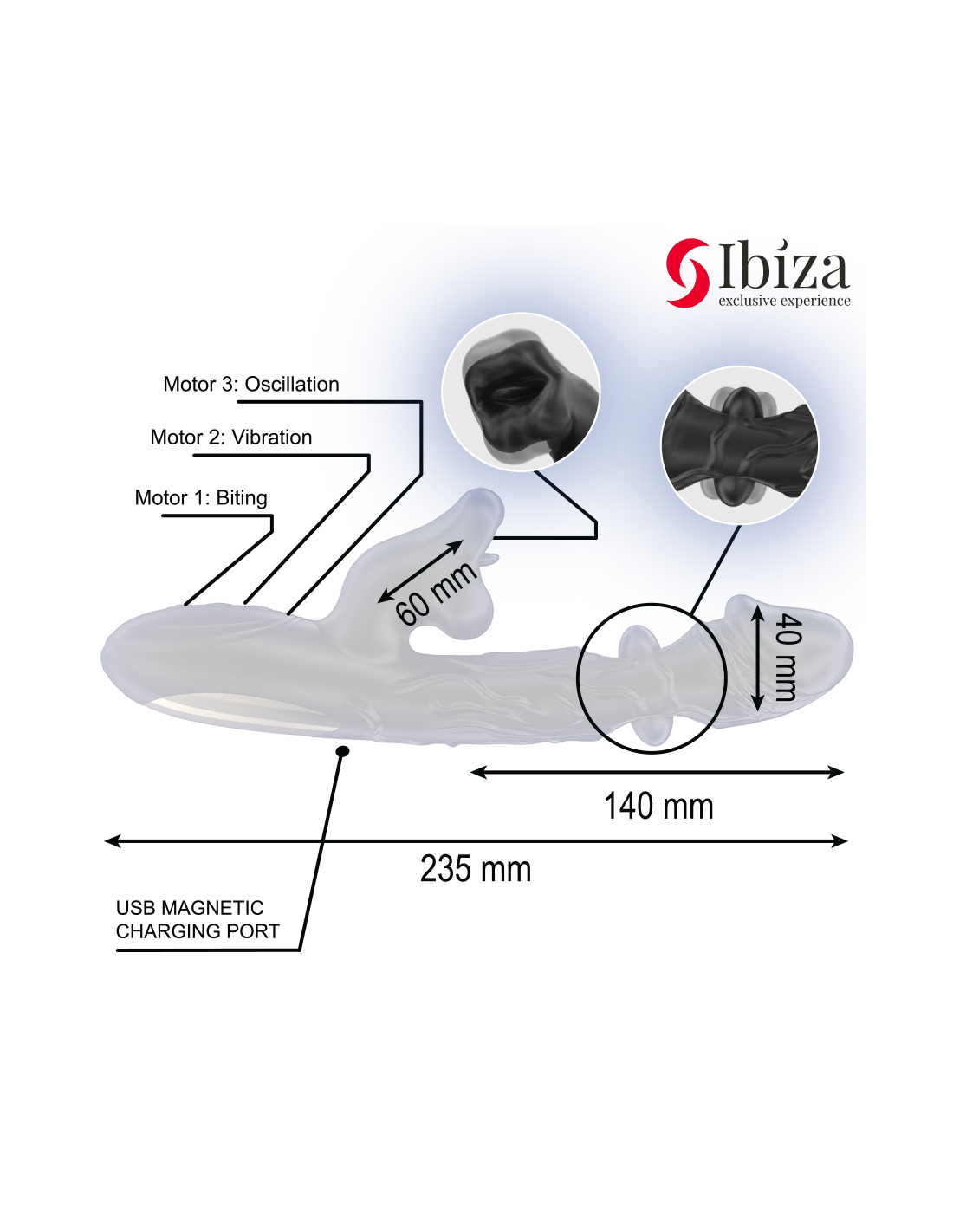 IBIZA vibratorius ir klitorio stimuliatorius su kandžiojimosi ir sukimosi efektu yra idealus pasirinkimas ieškantiems intensyvios ir įvairios stimuliacijos. Turėdamas 3 galingus variklius, 10 vibracijos režimų, 6 osciliacijos režimus ir 7 kandžiojimosi režimus, šis vibratorius suteikia daugialypę patirtį, netaupydamas pojūčių. Ergonomiškas dizainas, aukštos kokybės medžiagos ir atsparumas vandeniui daro jį puikiu pasirinkimu ieškantiems intensyvios stimuliacijos.
