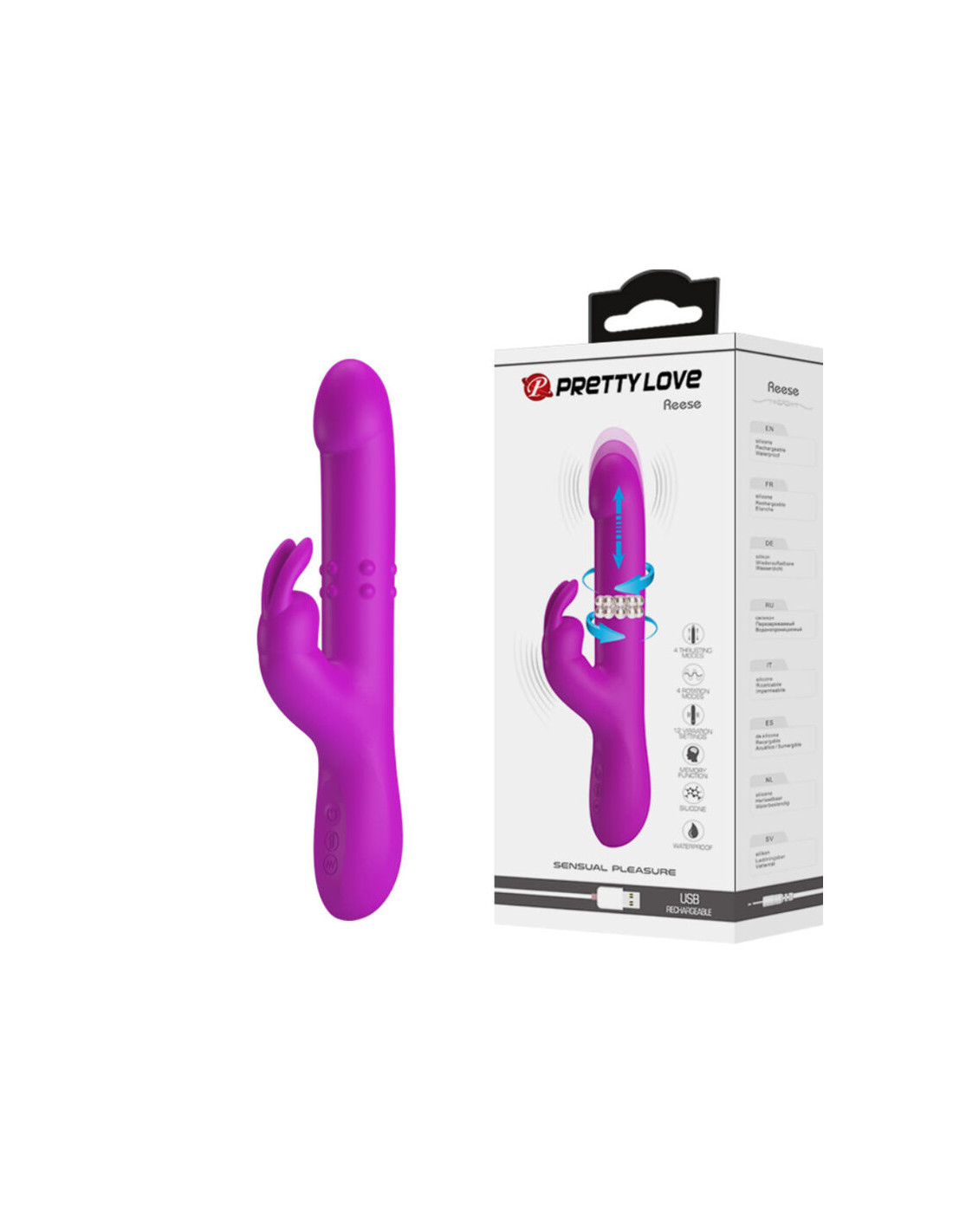 Triušio formos vibratorius su kelių greičių vibracija, stūmimu ir sukimu stimuliuoja makštį ir klitorį vienu metu! „Pretty Love“ triušio formos vibratorius yra malonios tekstūros ir sukasi bei juda giliai makštyje, masažuodamas G tašką. Lankstus stimuliatorius su vibracija tuo pačiu metu stimuliuoja ir klitorį. Šią malonumo programą su kelių greičių vibracija, stūmimu ir sukimu galima lengvai valdyti valdymo mygtuku. Vibratorius puikiai prisitaiko prie moters anatomijos ir yra pagamintas iš švelnaus, minkšto silikono, kuris žaidimo metu maloniai jaučiasi prie odos. Be to, vibratorių galima įkrauti pridedamu USB laidu.
