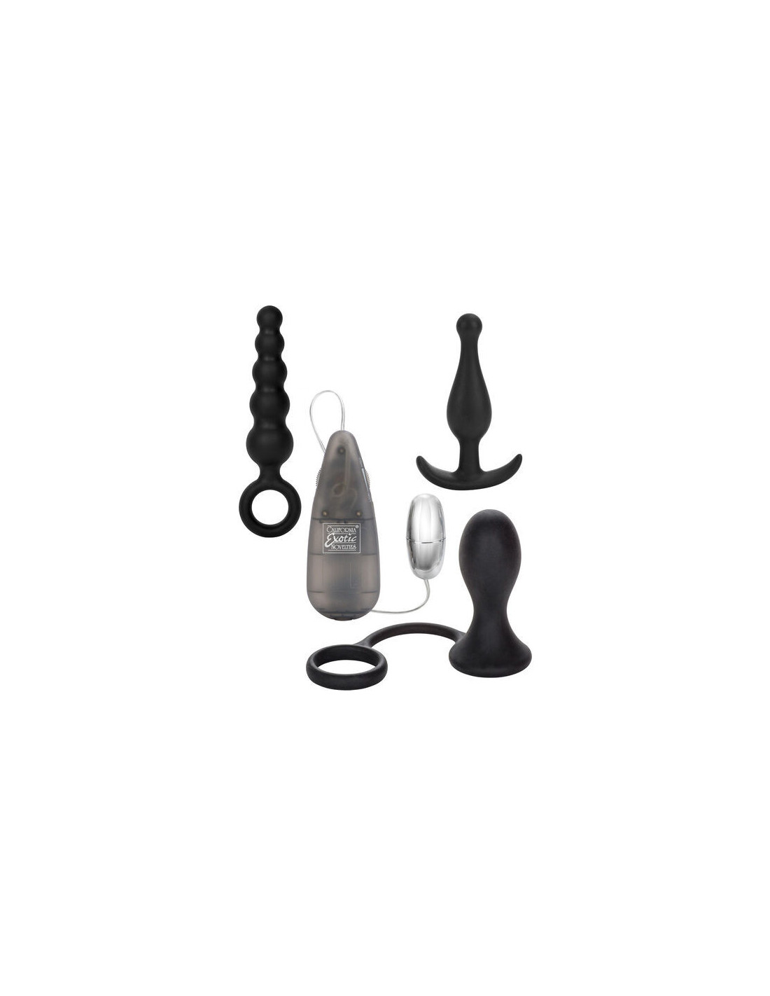 - Rinkinyje yra: du analiniai kamštukai, skirtingo greičio stimuliatorius ir silikoninis prostatos zondas su atraminiu žiedu, kad būtų lengva jį išimti.