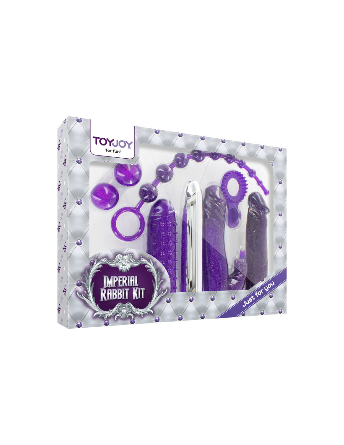 „Imperial Rabbit“ rinkinys siūlo 7 jaudinančius žaisliukus, kurie garantuoja itin malonų vakarą! Rinkinys yra violetinės ir sidabrinės spalvų, o pakuotė – žavinga. Jame yra chromuotas vibratorius, lanksti rankovė, rankovė su triušio klitorio stimuliatoriumi, dildo, varpos žiedas su stimuliuojančiais mazgeliais, analiniai karoliukai ir meilės kamuoliukų rinkinys. Baterijos: 2 C (nepridedamos). Pagaminta iš ABS plastiko, PVC ir TPE be ftalatų.