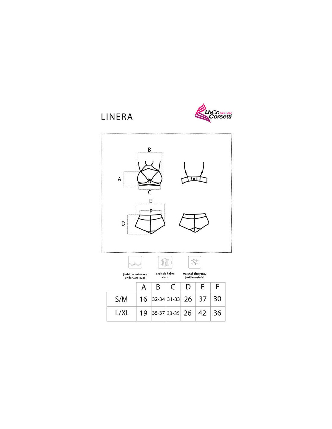 LIVCO CORSETTI SETS„Linera For the Senses“ rinkinį sudaro nėriniuota liemenėlė su gėlių raštu, sutvirtinta lankeliais, ir nėriniuotos kelnaitės. Liemenėlė praturtinta jausminga kaklo papuošalu, kuris intriguojančiai užbaigia iškirptę. Patogios, reguliuojamos petnešėlės ir trijų pakopų apimties reguliavimas puikiai priglunda prie bet kokios figūros. Aukštas kelnaičių juosmuo ir apdaila lygia medžiagos juostele užtikrina dėvėjimo patogumą ir įdomų vaizdą. Įstrižai kirpti ir tvirtai profiliuoti liemenėlės kaušeliai puikiai pabrėžia iškirptę ir pakelia krūtis, švelniai jas modeliuodami. Nėriniai, iš kurių pagamintas rinkinys, sudaryti iš 90 % poliamido ir 10 % elastano. Dėl to jie yra labai lankstūs, patvarūs ir minkšti, užtikrinantys didžiausią komfortą. Medžiaga, iš kurios pagamintas rinkinys, taip pat yra labai orui laidži, tinkama bet kokiam metų laikui. Jį galima naudoti tiek kaip kasdienius apatinius, tiek kaip apatinius ypatingai progai. „Linera For the Senses“ rinkinys taip pat yra puiki dovanos idėja.
