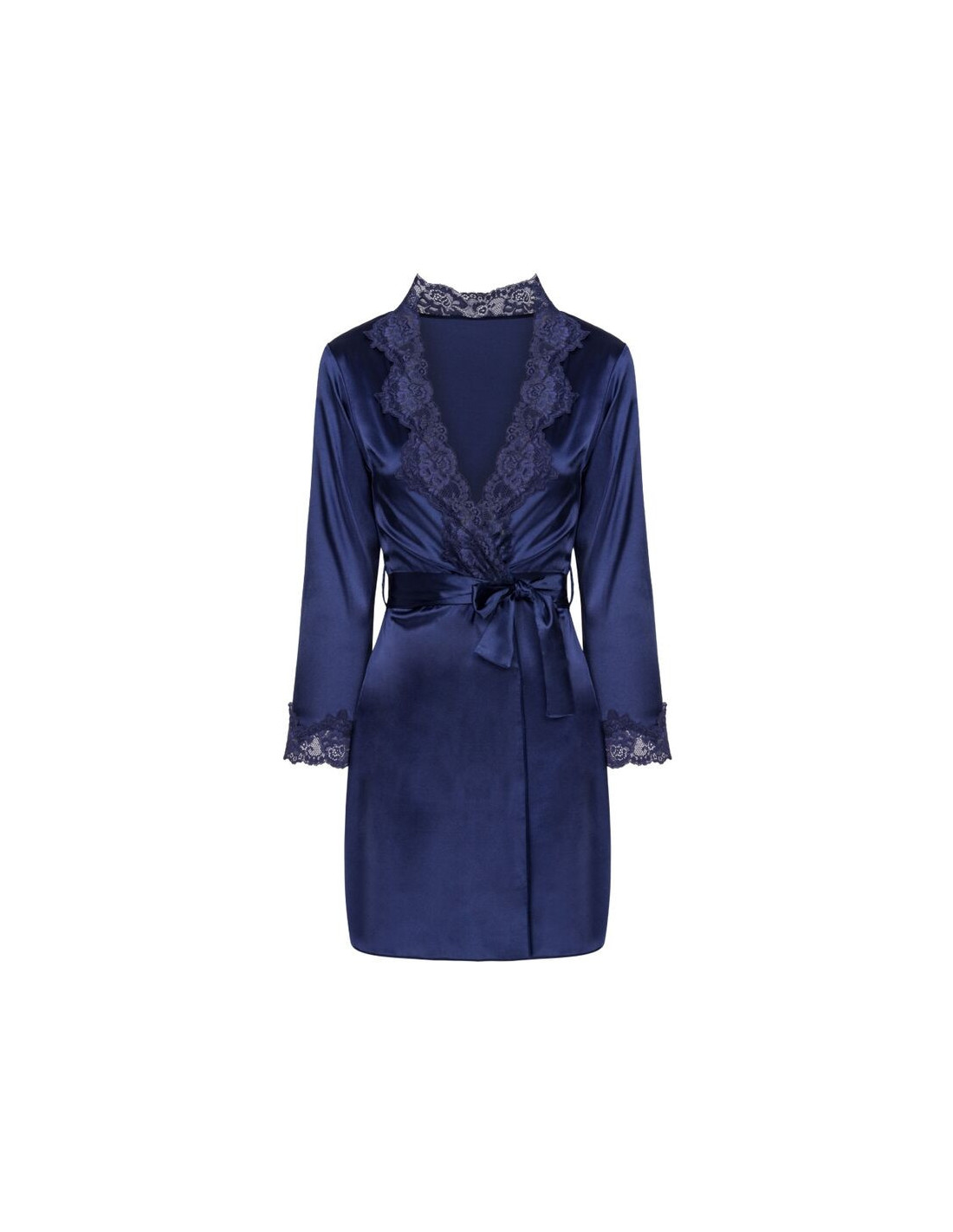LIVCO CORSETTI SETSIšskirtinai gražus apatinių komplektas iš blizgančio tamsiai mėlyno atlaso, chalatas su marškinėliais, siekiantis iki šlaunų vidurio. Chalato priekinė dalis ir ilgos rankovės, surištos per juosmenį diržu, dekoruotos dailiais nėriniais. Marškinėliai su plonomis, reguliuojamomis petnešėlėmis, dekoruoti tais pačiais nėriniais ties krūtine. Pridedamos stringeliai.