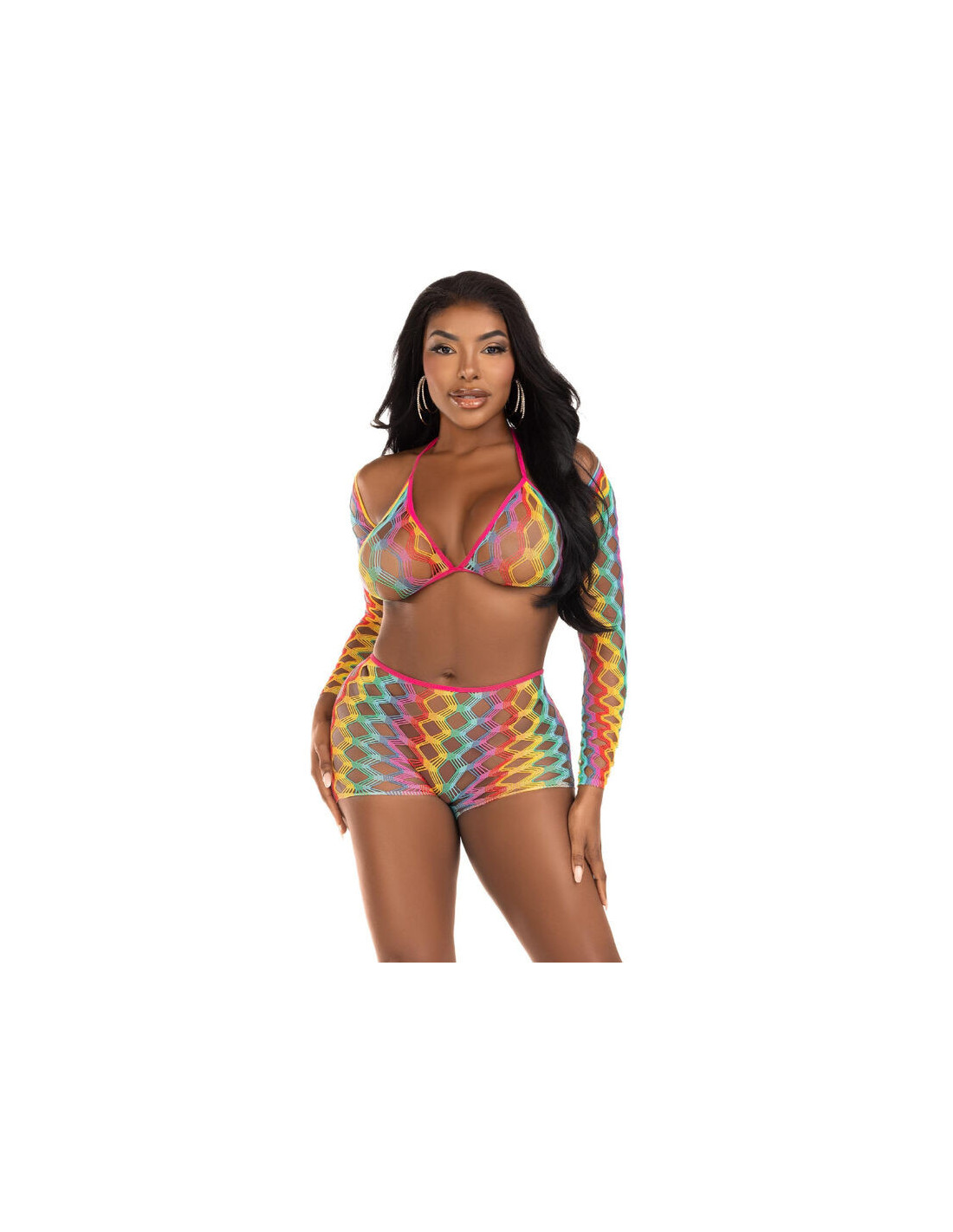 LEG AVENUE SETSTrijų dalių vaivorykštės spalvų viršutinių drabužių komplektas: liemenėlė, bolero ir tinkliniai šortai – tai stiliaus ir žaismingumo sprogimas. Sukurtas tiems, kurie nori išsiskirti ir išreikšti savo ryškią asmenybę, šis ansamblis yra drąsus mados ir originalumo pareiškimas.