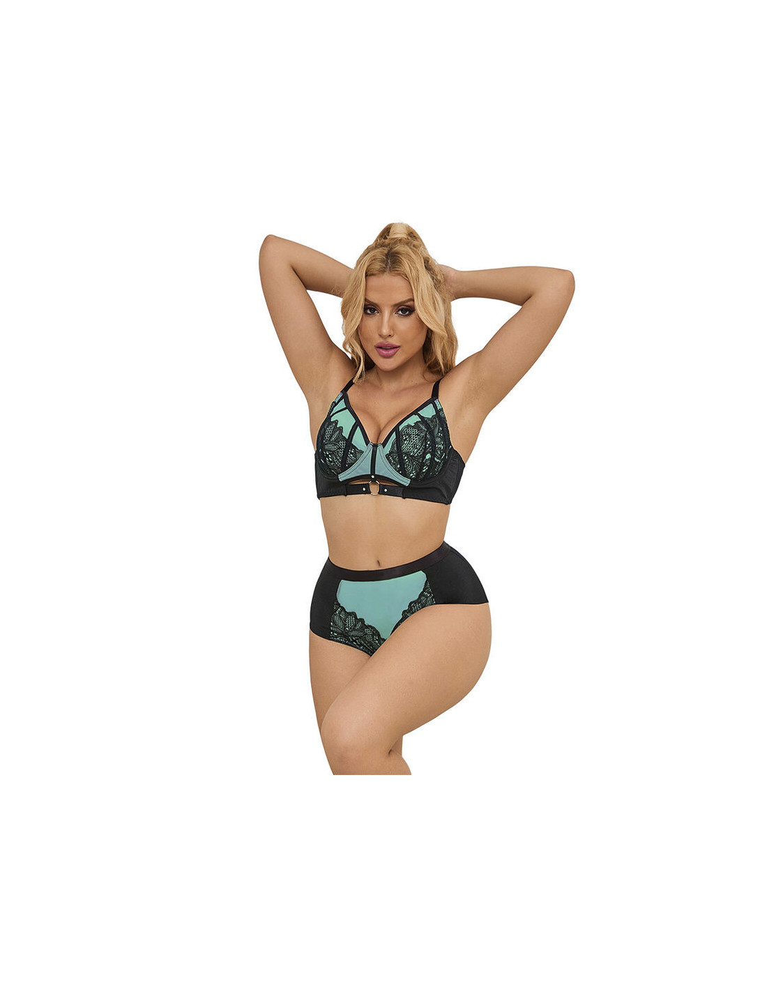 SUBBLIME SETSIšsiskirkite su „SUBBLIME“ žaliu nėrinių ir tinklelio apatinių komplektu su „Push-up“ liemenėle – drabužiu, sukurtu suderinti subtilumą, eleganciją ir jausmingumą viename. Šis komplektas paryškina jūsų figūrą romantišku ir rafinuotu dizainu, užtikrinančiu, kad kiekviena detalė būtų apgalvota, jog jaustumėtės unikaliai ir užtikrintai.