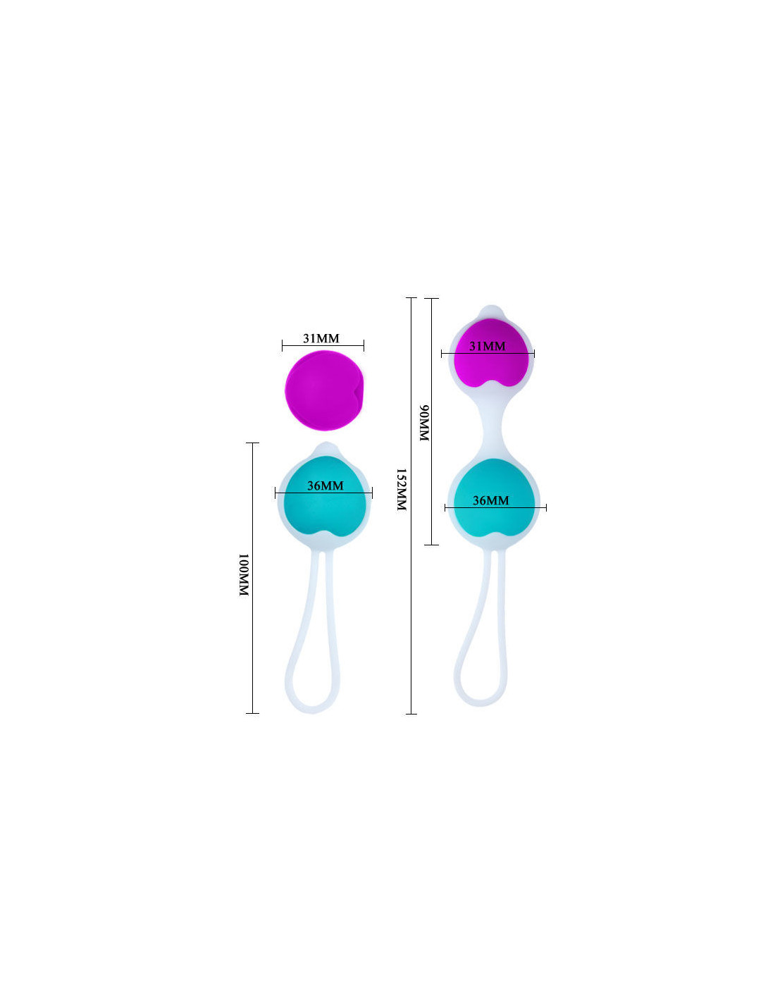 „Pretty Love“ kamuoliukų skersmuo yra 3,6 cm ir 3,1 cm, o bendras ilgis, įskaitant virvę kiniškam kamuoliukui ištraukti, – 15,25 cm.
