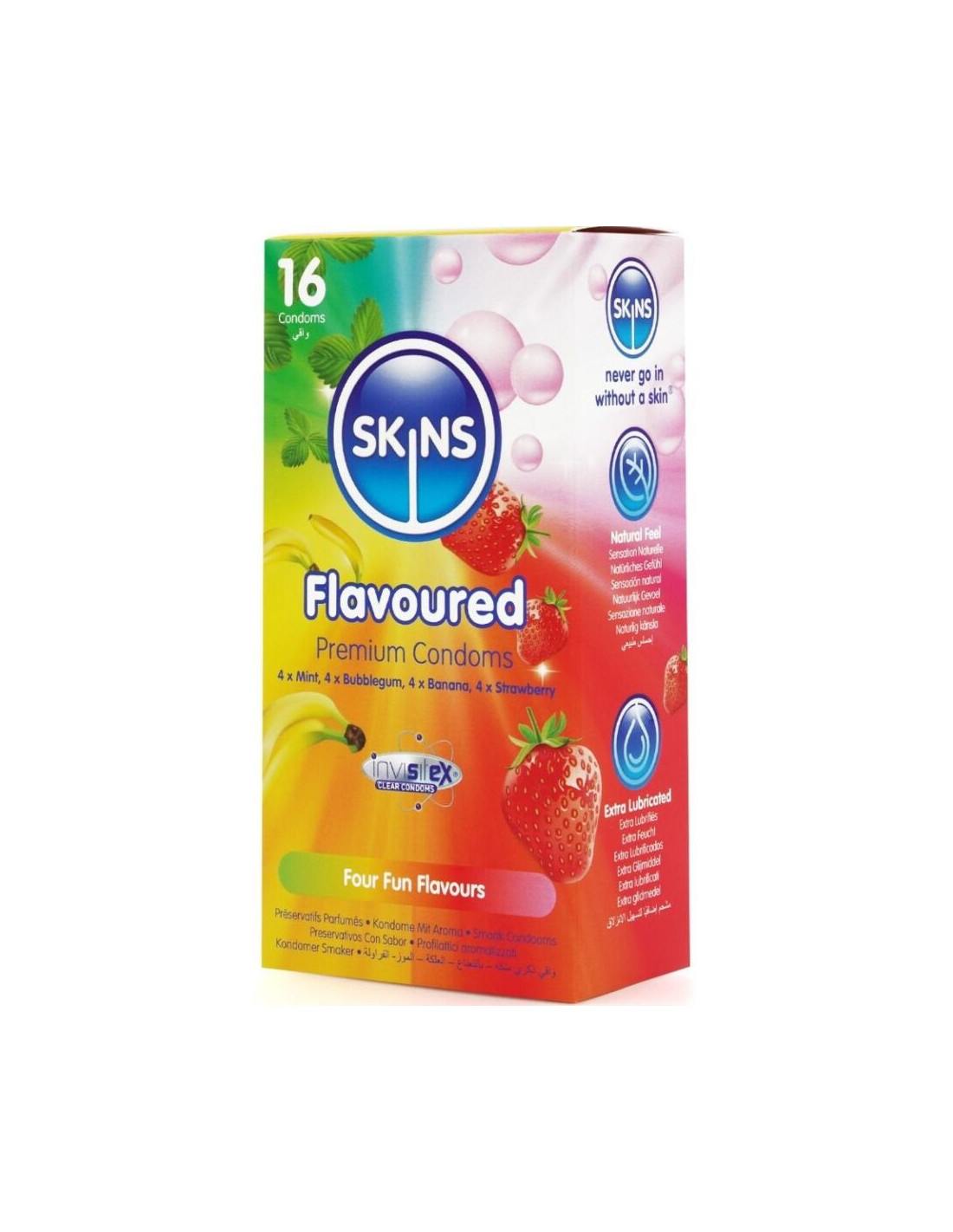Pristatome „Skins“ skonio 16 prezervatyvų pakuotę: stilingą, paruoštą naudoti sprendimą, kuriame yra iki 33 % daugiau prezervatyvų nei rinkos lyderio pakuotėje. Šioje įdomioje kelių skonių pakuotėje yra keturi viliojantys skoniai: bananų, kramtomosios gumos, mėtų ir braškių, suteikiantys vartotojams smagų ir skanų būdą sustiprinti intymumą bet kokia proga. Kiekvienas prezervatyvas yra atskirai supakuotas ir pagamintas iš aukščiausios kokybės natūralaus latekso, suteikiančio natūralų pojūtį, skaidrumą ir tvirtumą. Praturtinti papildomu lubrikantu ir skaniais kvapais, šie prezervatyvai panaikina tipinį latekso kvapą, kad užtikrintų malonesnę patirtį.