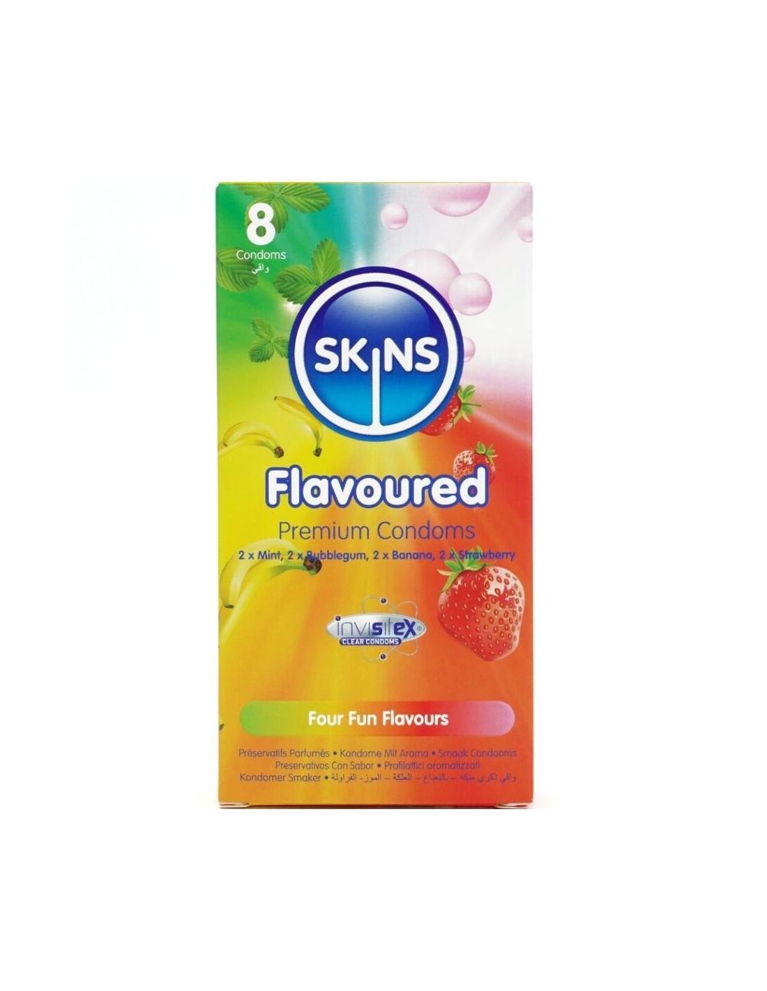 Pristatome „Skins Flavor“ 8 prezervatyvų pakuotę: stilingą, paruoštą naudoti sprendimą, kuriame yra iki 33 % daugiau prezervatyvų nei rinkos lyderio pakuotėje. Šioje įdomioje pakuotėje yra keturi viliojantys skoniai: bananų, kramtomosios gumos, mėtų ir braškių, suteikiantys vartotojams smagų ir skanų būdą sustiprinti intymumą bet kokia proga. Kiekvienas prezervatyvas yra atskirai supakuotas ir pagamintas iš aukščiausios kokybės natūralaus latekso, kuris suteikia natūralų pojūtį, skaidrumą ir tvirtumą. Praturtinti papildomu lubrikantu ir skaniais kvapais, šie prezervatyvai panaikina tipinį latekso kvapą, kad užtikrintų malonesnę patirtį.