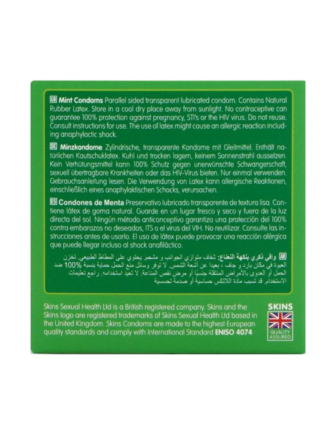 Pristatome „Skins Mint“ 4 prezervatyvų rinkinį – elegantišką, mažmeninei prekybai paruoštą formatą, kuriame yra iki 33 % daugiau prezervatyvų vienoje pakuotėje nei rinkos lyderio pakuotėje, todėl pasižymi išskirtine verte ir patrauklia išvaizda. Šie prezervatyvai, sukurti malonesniam oraliniam seksui, yra gaivaus mėtų skonio ir pagaminti iš aukščiausios kokybės natūralaus latekso, kad būtų skaidrūs, tvirti ir natūralūs. Itin ploni, kad būtų užtikrintas didesnis intymumas, jie sukurti taip, kad jaustųsi kaip antra oda, kartu užtikrindami patikimą apsaugą ir komfortą.