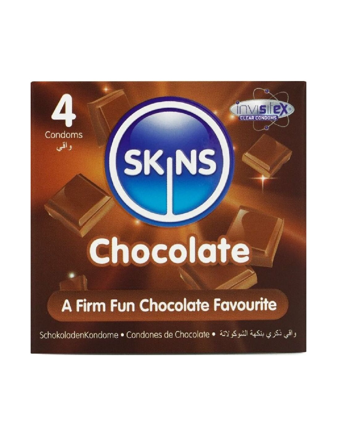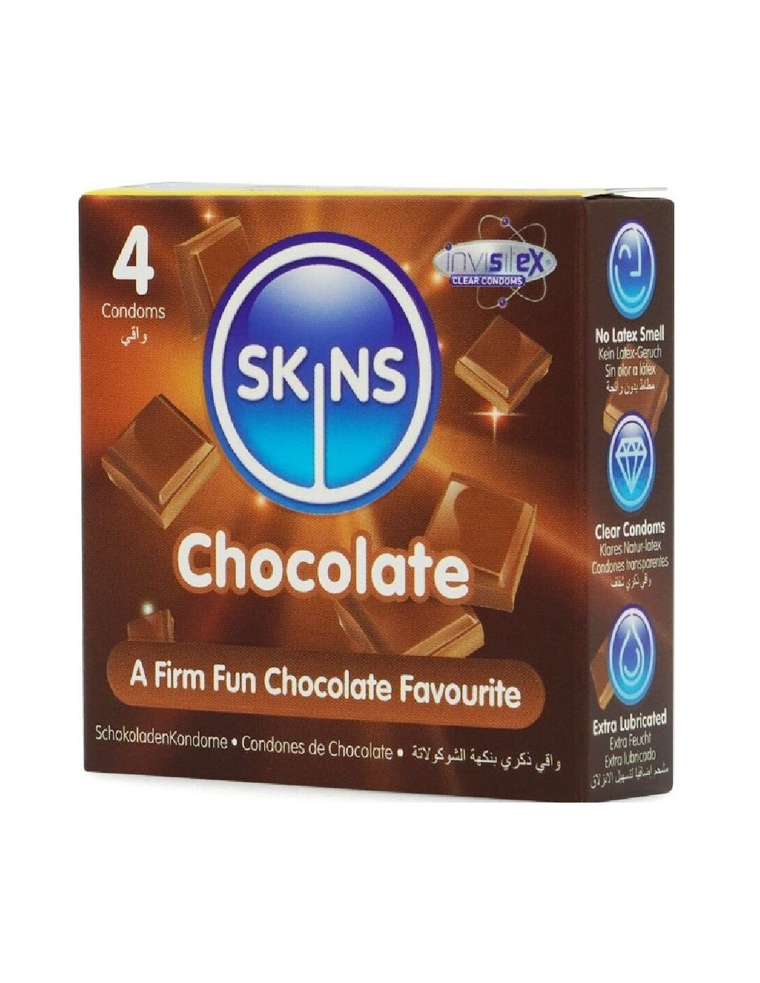 Pristatome mūsų naują šokolado skonio 4 prezervatyvų pakuotę, pasižyminčią elegantišku, paruoštu naudoti dizainu ir iki 33 % daugiau prezervatyvų nei rinkos lyderio. „Skins“ šokolado skonio prezervatyvai skirti tiems, kurie ieško smagaus, aukštos kokybės intymaus produkto. Šie individualiai supakuoti prezervatyvai sujungia malonų skonį ir puikią apsaugą, todėl yra idealus pasirinkimas suaugusiųjų prekių parduotuvėms, vaistinėms ir sveikatingumo prekių mažmenininkams. Šie „Skins“ prezervatyvai yra puikus būdas suderinti dvi meiles: seksą ir šokoladą. Jie yra sutepti ir turi gardų šokolado aromatą, kuris išties vilioja, be to, jie yra šokolado skonio. Kaip ir visi „Skins“ prezervatyvai, jie pagaminti iš aukštos kokybės, dermatologiškai patikrinto latekso, suteikiančio jums reikiamą apsaugą.