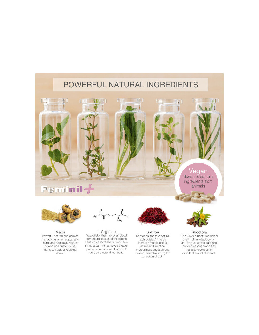 - L-ARGININAS – kraujagysles plečianti medžiaga, gerinanti kraujotaką ir atpalaiduojanti klitorį, dėl ko padidėja kraujotaka toje srityje. Tai padidina seksualinį potencialą ir malonumą santykiuose. Veikia kaip natūralus lubrikantas.