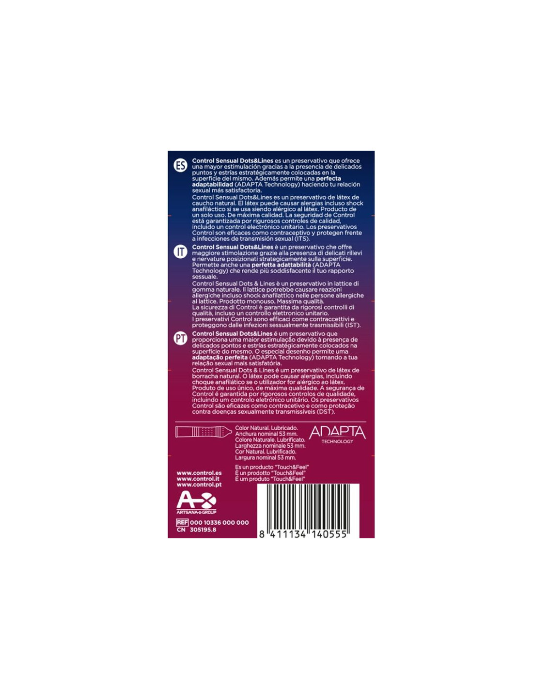 „Control Sensual Dots&lines“ – tai prezervatyvas, kuris dėl strategiškai ant paviršiaus išdėstytų subtilių taškelių ir griovelių suteikia didesnę stimuliaciją. Jis taip pat puikiai prisitaiko (ADAPTA technologija), todėl jūsų lytiniai santykiai teikia daugiau pasitenkinimo.
