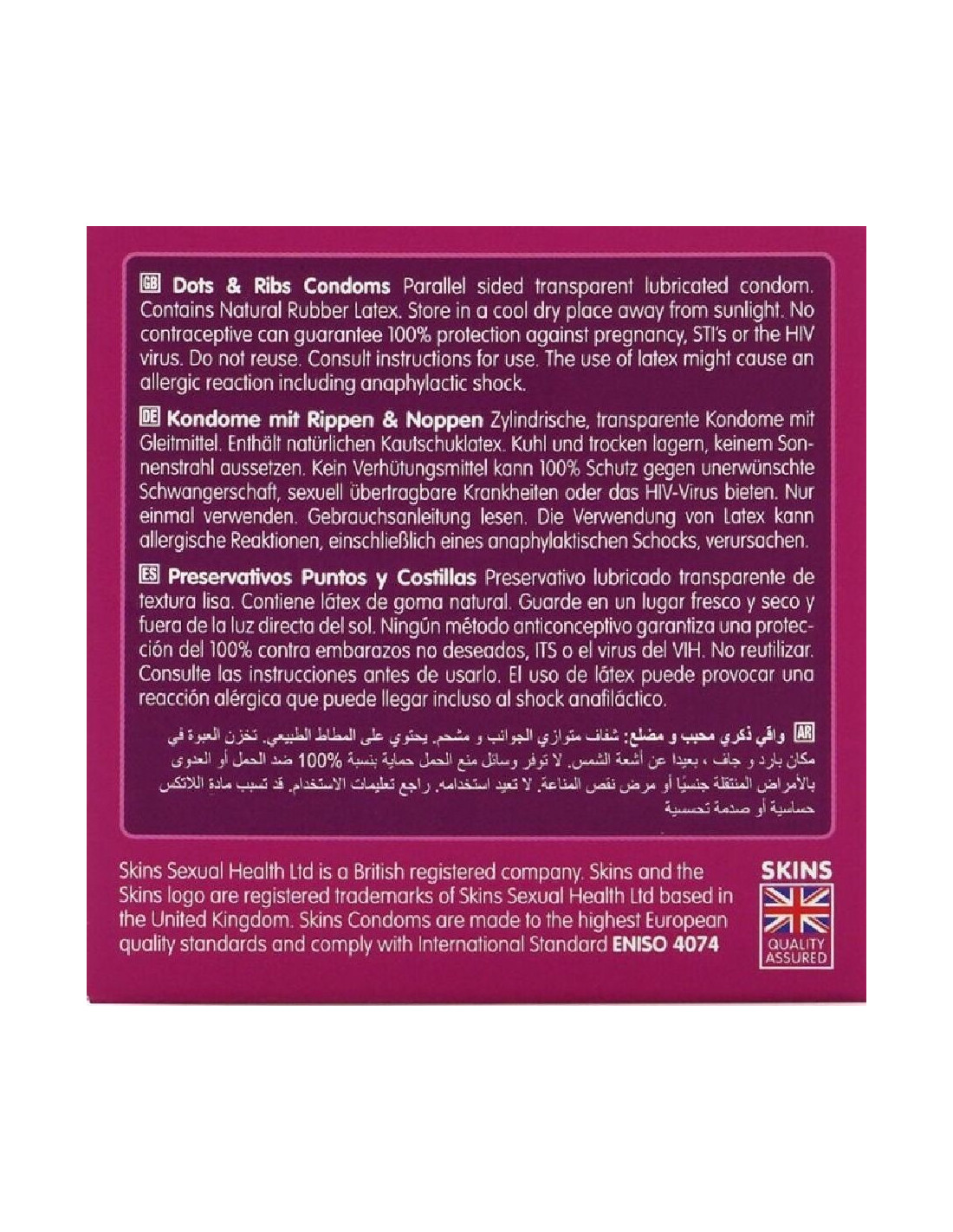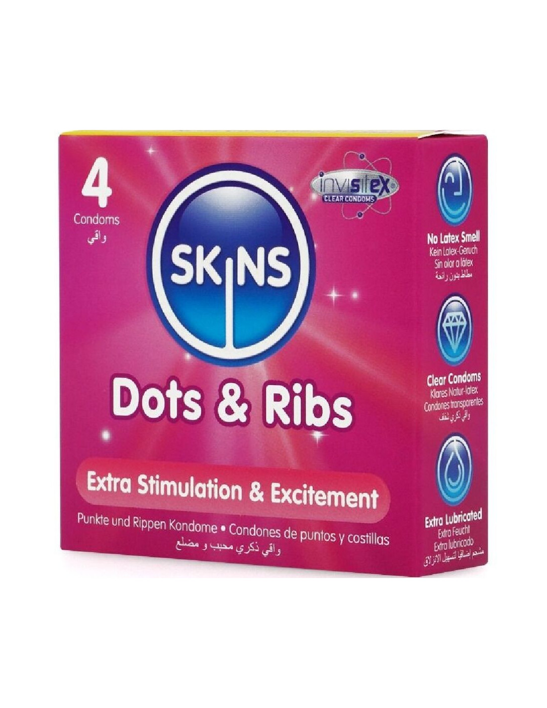 „Skins“ sujungė strategiškai išdėstytus iškilusius šonkaulius, kad nešiotojui suteiktų didesnį malonumą, su maloniai subtiliais taškeliais, kad partneriui suteiktų sustiprintus pojūčius, harmoningai veikdami, kad abu partneriai maksimaliai padidintų malonumą ir malonumą intymių akimirkų metu. „Skins Dots & Ribs“ prezervatyvai pagaminti iš aukščiausios kokybės natūralaus latekso, kad būtų permatomi, patobulinti ir patvarūs. Tokie ploni, kad jaučiasi kaip antra oda! Niekada neikite į vidų be „Skin“!
