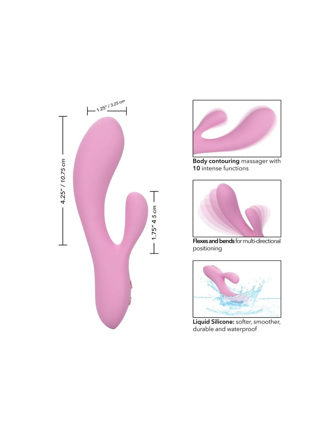 Pasiekite naujas malonumo aukštumas su fantastiškai lanksčiu „Contour Zoie“. Intymių kontūrų dvigubas masažuoklis yra toks pat jaudinantis, kaip ir universalus, su itin lanksčiu korpusu, vibruojančiu dirgikliu ir 10 atpalaiduojančių vibracijos funkcijų. Mėgaukitės stulbinančia G taško stimuliacija, kokios dar niekada nepatyrėte, su paryškintu G stimuliatoriaus antgaliu ir intensyviomis dvigubo variklio pulsacijomis. Šis galingas dvigubas masažuoklis sukurtas su išlenktu G velenu ir natūraliai išlenktu stimuliatoriumi, kad patenkintų jūsų intymiausias kūno linkius. Nuo garuojančių dušų iki karštų akimirkų vonioje – žaiskite su vandeniui atspariu paviršiumi ir 10 itin galingų vibracijos funkcijų. Lengvai valdomas 2 mygtukų valdymas leidžia perjungti kelius drebančius nustatymus. Nors patogūs jutikliniai mygtukai kontroliuoja intensyvumą, o vibracija suteikia norimą stimuliaciją, lankstus korpusas išlaiko bet kokią norimą padėtį. Įkraukite aukščiausios kokybės silikoninį stimuliatorių per 2,5 valandos naudodami pridedamą USB įkrovimo laidą ir mėgaukitės 40 minučių greita stimuliacija arba 90 minučių mažo greičio vibracija. Aukščiausios kokybės skysto silikono dizainas yra minkštas, lygus, patvarus ir atsparus vandeniui.