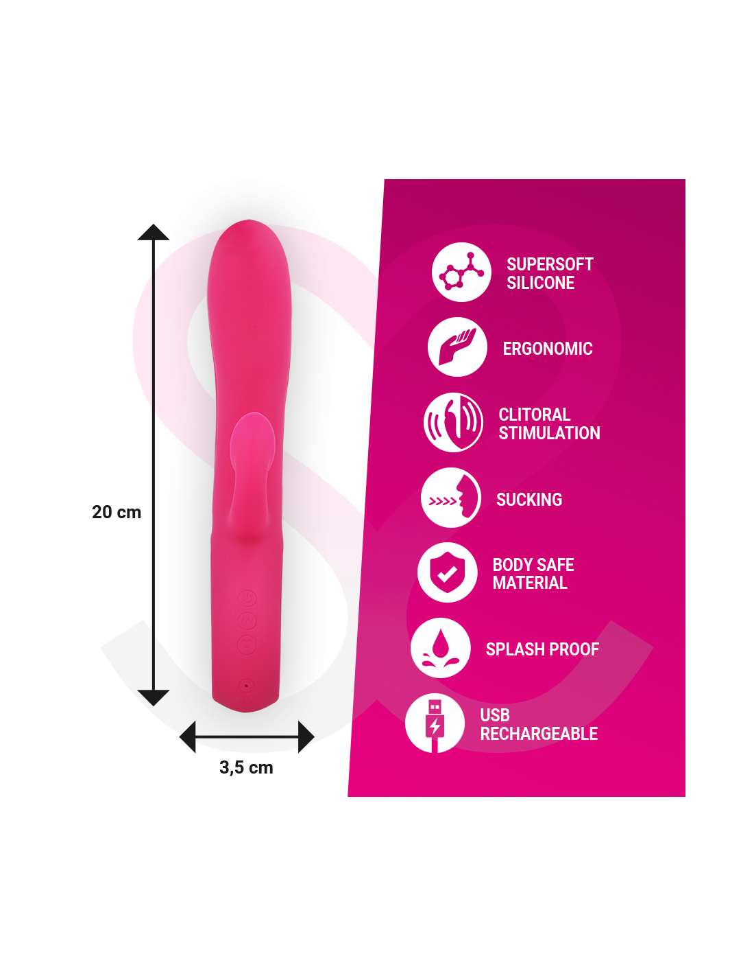 Du nepriklausomi varikliai su klitorio siurbimo sistema, galingos, bet tylios vibracijos garantuoja jaudinančiausius orgazmus. Šis malonumo objektas perrašo vibruojančių triušių istoriją, vienu metu vibruodamas ir siurbdamas.