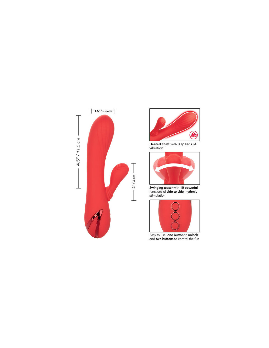 Neįtikėtinas šildantis masažuoklis pasiekia maksimalią raminančią temperatūrą vos per 3 minutes, kad galėtumėte mėgautis maloniu laiku. Ritmiškos šoninės stimuliacijos funkcijos užtikrina stulbinančią klitorio stimuliaciją, o kontūruotas kotas lepina giliais vibratoriais. Valdykite ir pritaikykite savo malonumo žaidimus su nepriklausomai valdomomis vibracijos ir stimuliatoriaus funkcijomis.
