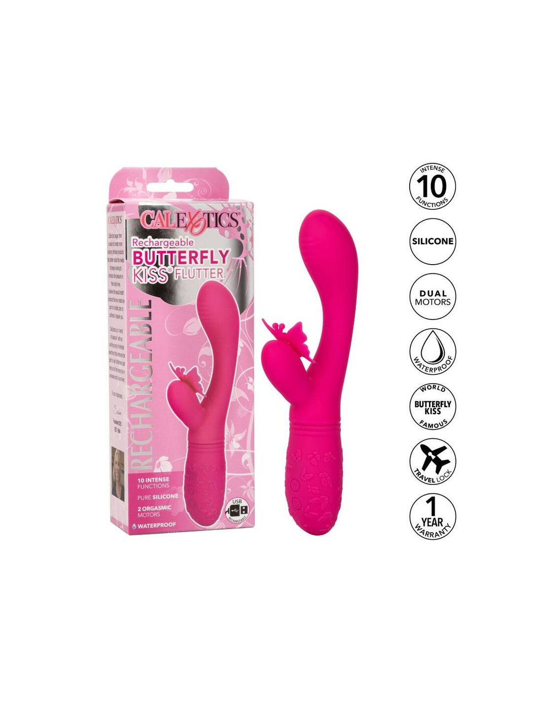 CALEXOTICSSukurtas intymiems malonumams, įkraunamas „Butterfly Kiss Flutter“ yra erotinių žaislų dėžutė, kurią privalo įsigyti kiekvienas malonumų mylėtojas. Šis jausmingų kontūrų masažuoklis skirtas dar labiau sustiprinti jūsų malonumą su 10 vibracijos funkcijų, galingais dvigubais varikliais ir plazdėjančiu drugelio formos erzintuvu. Raudonuojantis drugelis puikiai tinka pradedantiesiems ir jausmingam pasirinkimui erotinės patirties turintiems asmenims. Pasinerkite į 10 galingų vibracijos, pulsavimo ir eskalavimo funkcijų naudodami mygtuką. Du didelio intensyvumo varikliai skleidžia jaudinantį vibravimą kiekviename šio aistringo vibratoriaus centimetre. Šio lanksčio drugelio plazdantys sparneliai ir antenos vis greičiau plasnoja su kiekvienu vibracijos pasikeitimu, kad kutentų išorines saldžias taškelius. Žaismingai mėgaukitės iki 55 minučių mažo greičio arba 40 minučių didelio greičio vibracija su paprastu valdymu jutikliniais mygtukais. Įkraukite savo malonumą vos per 1,25 valandos naudodami pridedamą USB įkrovimo laidą.