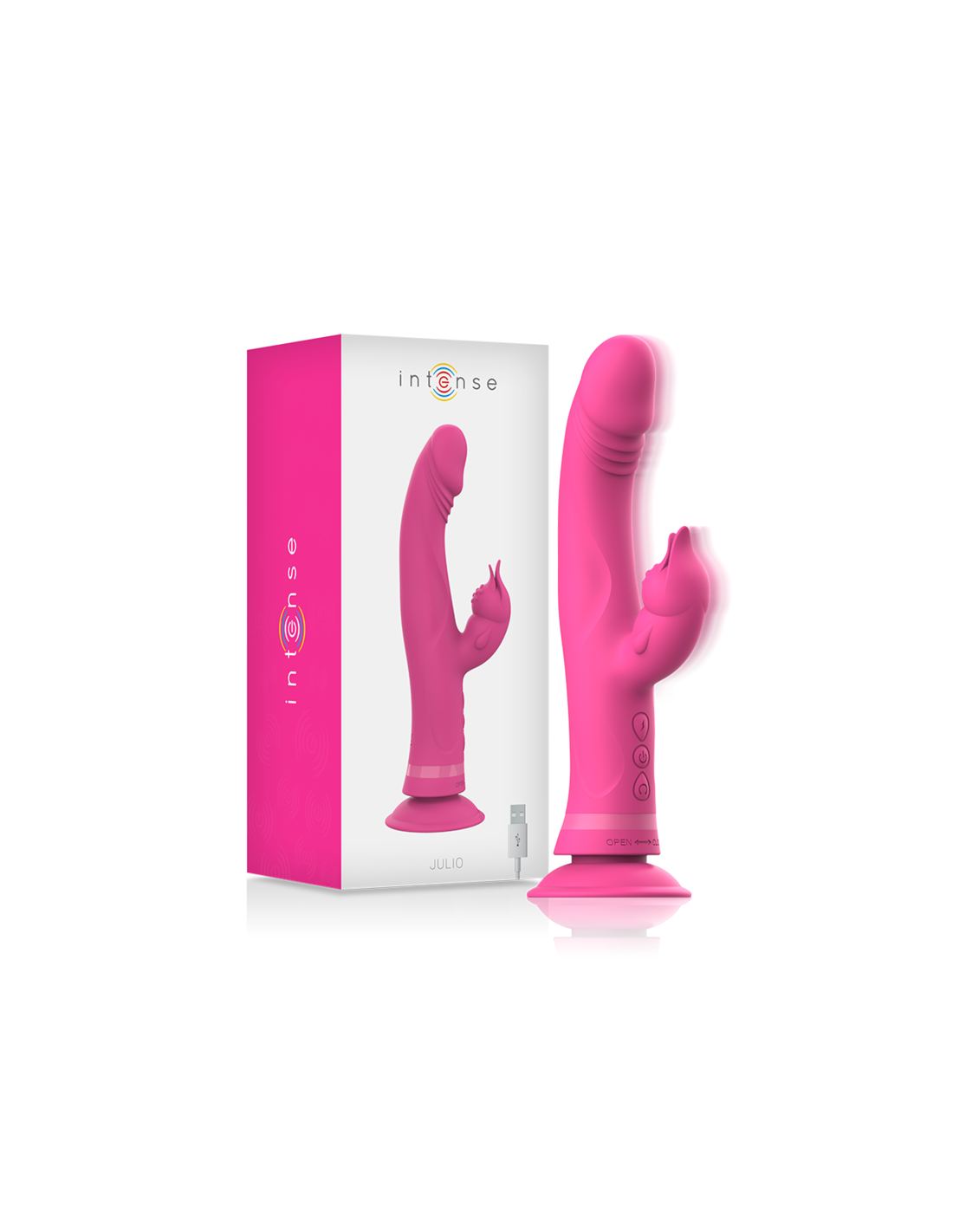 INTENSE HIGH TECHSilikoninis „Intense™ Julio“ sujungia dvigubą jūsų karštų taškų stimuliavimą su jausmingu viso kūno masažu: abi funkcijas galima valdyti atskirai. 2 varikliai užtikrina visišką galią.