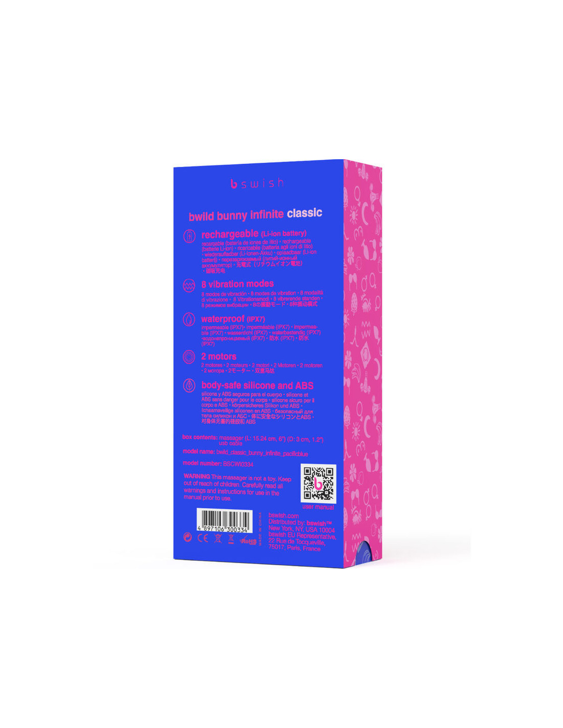 Susipažinkite su malonumų „OG“ – „Bwild Bunny Infinite Classic“ . Garantuotas malonumas su 2 galingais varikliais, 4 greičio intensyvumais ir 4 režimais. Kartu su šilkiniu švelnumu, vingiuotu, 100 % kūnui saugiu silikonu ir itin tiksliu kutenimu, jis yra atsparus vandeniui ir paruoštas maudynėms.