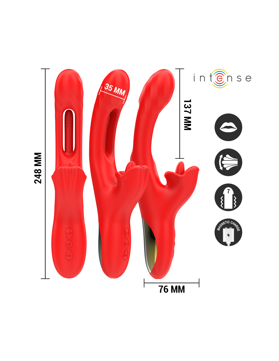 INTENSE HIGH TECHINTENSE Jessica“ vibratorius – tai daugiafunkcio malonumo šedevras, sukurtas tiems, kurie ieško gilios, išorinės ir vidinės stimuliacijos, pasitelkdami naujausias technologijas. Šis novatoriškas modelis išsiskiria tuo, kad siūlo visavertę patirtį dėl besisukančios laižymo klitorio stimuliacijos, derinamos su vidiniu osciliavimu ir galinga vibracija, kurias valdo 3 nepriklausomi varikliai.