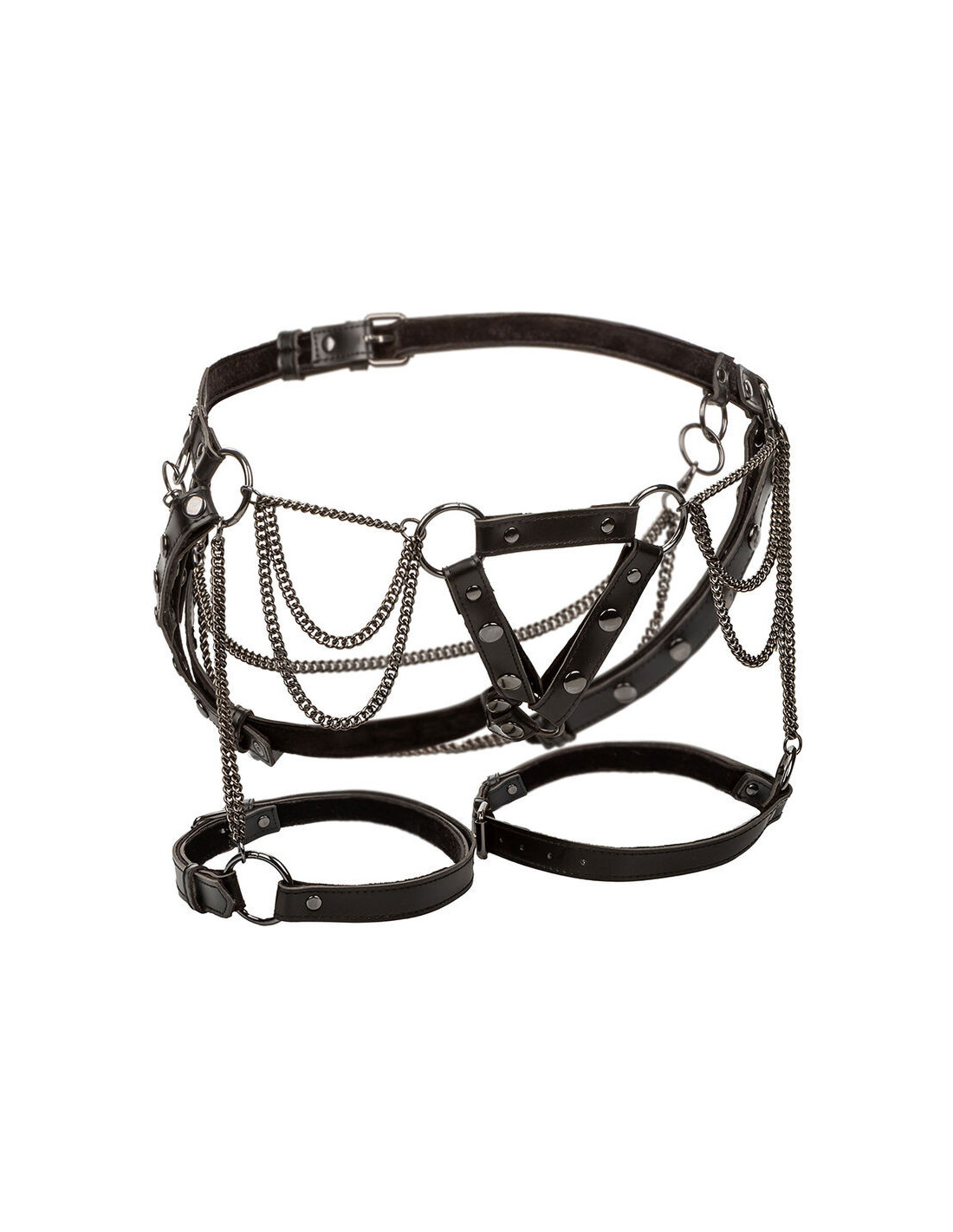Papuoštas tvirtomis metalinėmis grandinėlėmis, šis aukščiausios kokybės šlaunų diržas yra pagrindinis aksesuaras tiems, kurie mėgsta gundymą ir galią.