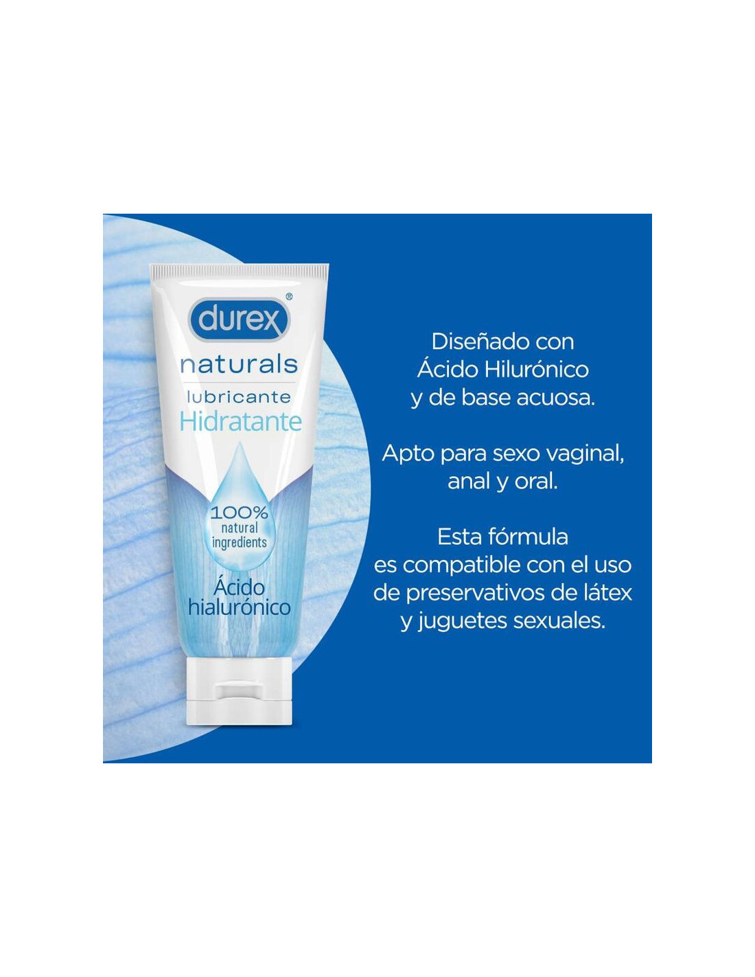 „Durex Natural Moisturizer“ – tai lubrikantas, pagamintas iš 100 % natūralių ingredientų ir natūralios hialurono rūgšties, užtikrinančios ilgalaikį drėkinimą. Šis „Durex“ intymios higienos lubrikantas suteikia šiuos privalumus: