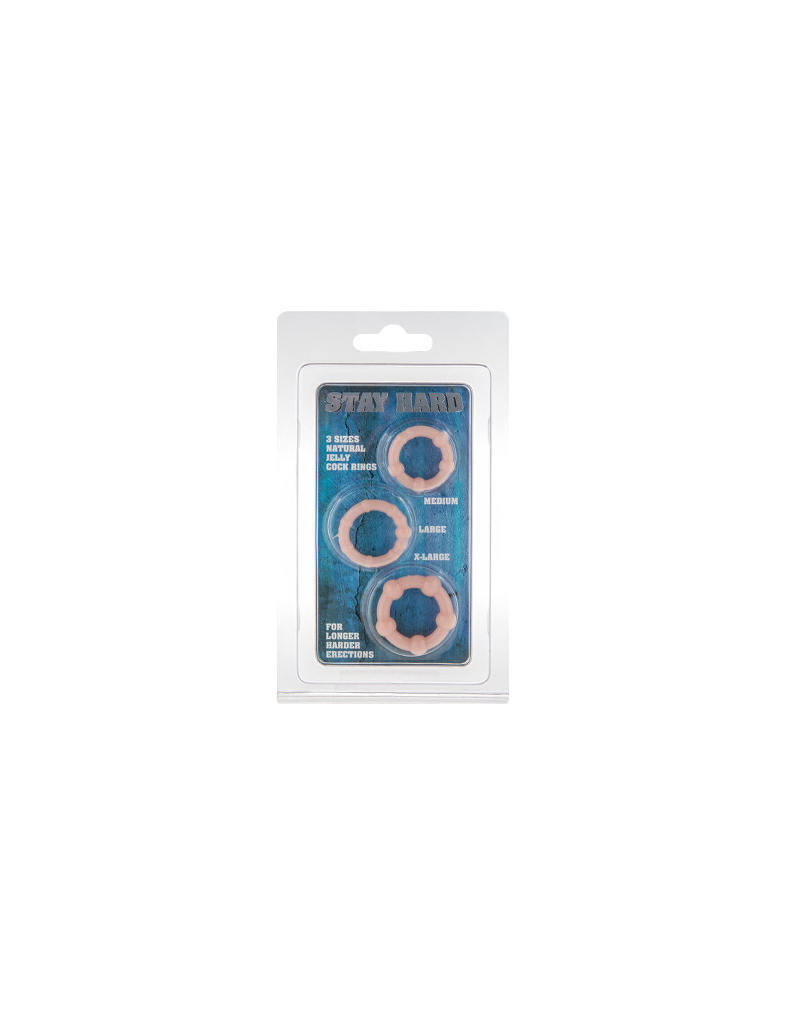„STAY HARD THREE RINGS“ – tai rinkinys, kurį sudaro trys skirtingo dydžio silikoniniai žiedai, prisitaikantys prie bet kokio dydžio penio, su kuriais erekcija išliks daug ilgesnė, nes žiedai leidžia atidėti ejakuliaciją ir išlaikyti penį erekcijos būsenoje ilgiau.