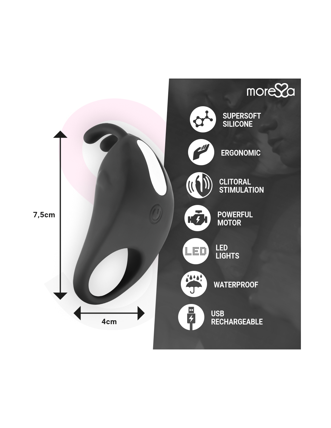 „Moressa“ yra etalonas savo dizainu, kokybe ir technologijomis. Sukūrėme novatorišką produktą ir pasirūpinome kiekvienu gamybos procesu, kad pasiektume geriausią rezultatą. „Moressa“ yra energijos, stiprybės ir garantijos simbolis. Įsigydami sekso žaisliuką „Moressa“, jaučiatės atspindėti šiandienos naujienose. Kiekvienas „Moressa“ žaisliukas nukels jus į skirtingus pojūčius. Neprilygstamas rezultatas dėka patogaus aukščiausios kokybės silikono ir ergonomiško dizaino.