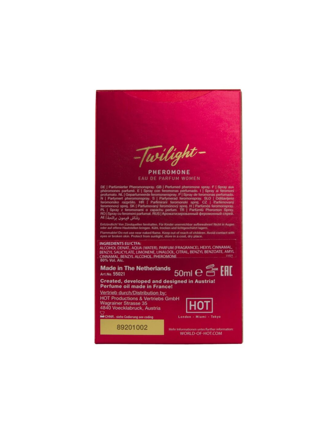 Alkoholis Denat., Aqua (vanduo), Parfum (kvapioji medžiaga), Hexyl Cinnamal, Benzyl Salicylate, Limonene, Linalool, Citral, Benzyl Benzoate, Amyl Cinnamal, Benzyl Alcohol, Geraniol, Farnesol, Eugenol, Feromonai.