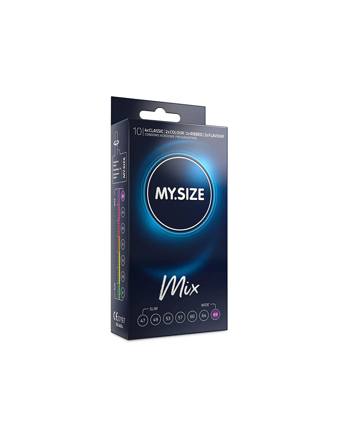 - PASIŪLYMAS: 10 MY.SIZE prezervatyvų 4 variantų: 4 klasikiniai, 2 briaunoti, 2 skonio, 2 spalvoti. 69 mm. CE ženklas. Atitinka ES direktyvą 93/42/EEB dėl medicinos prietaisų. Galima įsigyti ir kitų nominalių pločių. Pridedama nemokama internetinė matavimo programėlė.