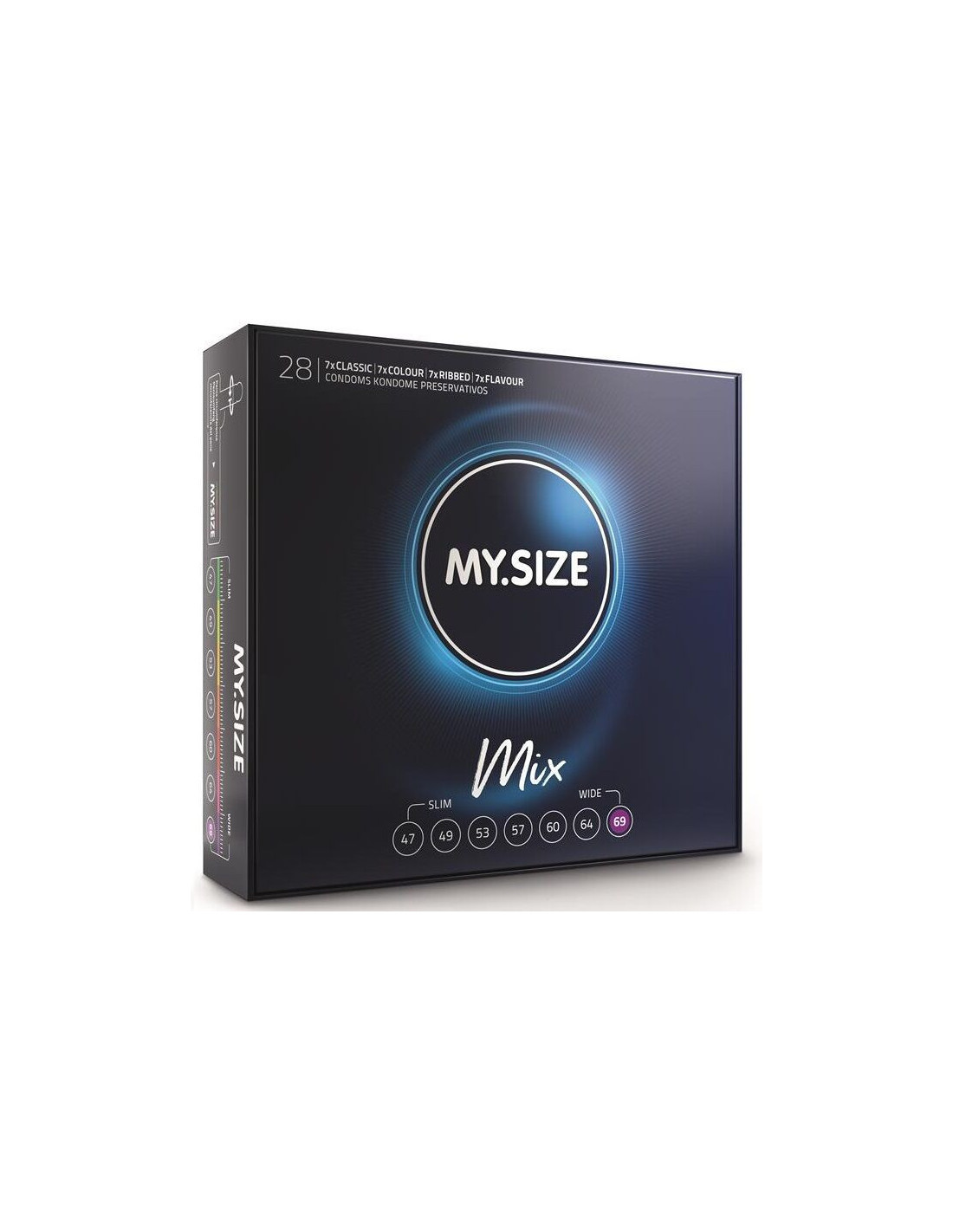 - PASIŪLYMAS: 28 MY.SIZE prezervatyvai 4 variantų: 7 klasikiniai, 7 briaunoti, 7 skoniai, 7 spalvoti. 69 mm. CE ženklas. Atitinka ES direktyvą 93/42/EEB dėl medicinos prietaisų. Galima įsigyti ir kitų nominalių pločių. Pridedama nemokama internetinė matavimo programėlė.