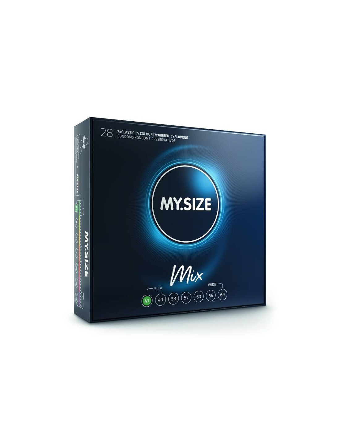 - PASIŪLYMAS: 28 MY.SIZE prezervatyvai 4 variantų: 7 klasikiniai, 7 briaunoti, 7 skoniai, 7 spalvos. 47 mm. CE ženklas. Atitinka ES direktyvą 93/42/EEB dėl medicinos prietaisų. Galima įsigyti ir kitų nominalių pločių. Pridedama nemokama internetinė matavimo programėlė.