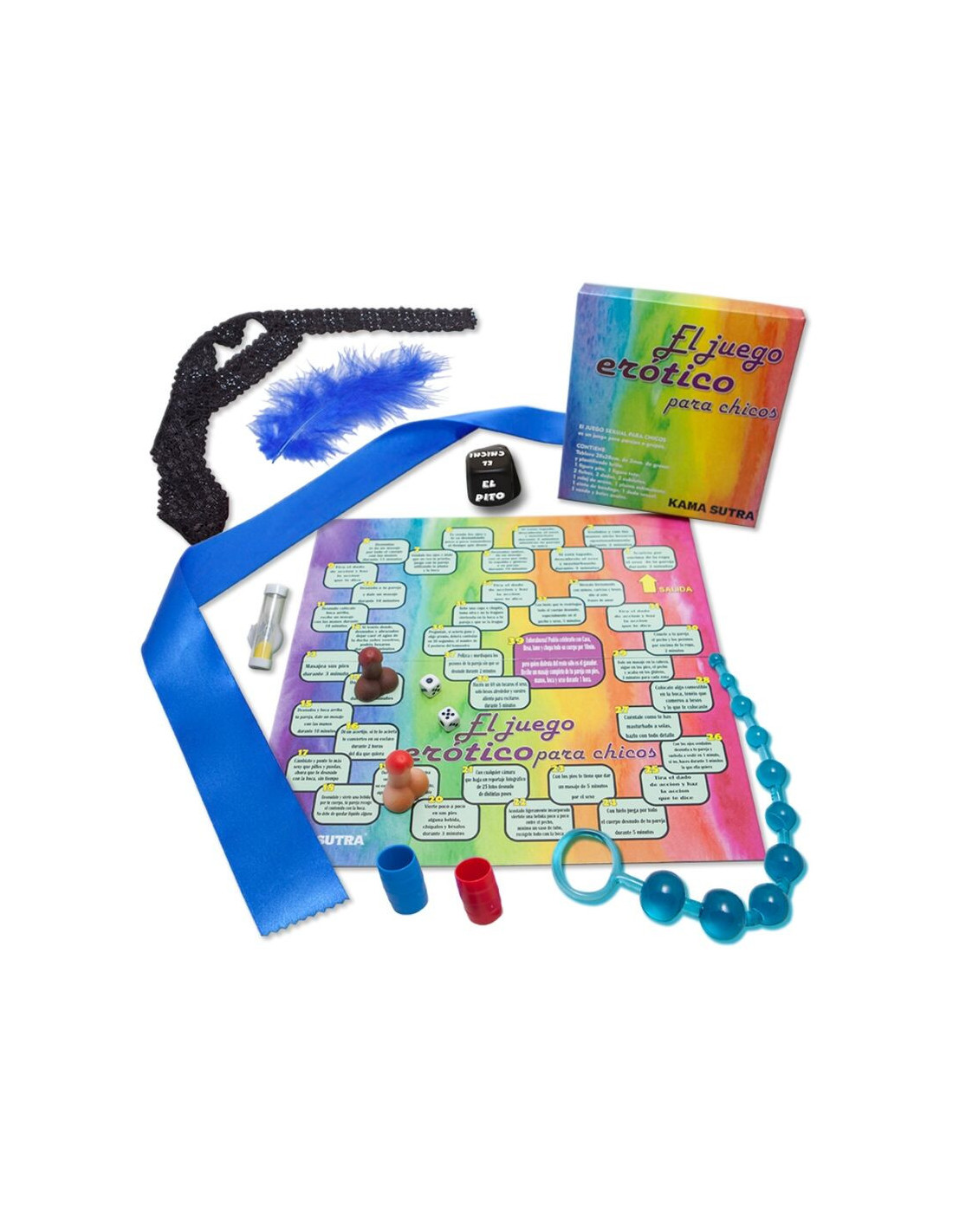 RINKINĮ YRA: ATSITIKTINIS ŽAISLĖLIS , INSTRUKCIJOS, PRIRIŠIMO JUOSTELĖ, AKIŲ JUOSTELĖ, STIMULIACINIS RAŠIKLIS, AUKŠTOS KOKYBĖS KAULIUKAI, SMĖLIO LAIKRODIS, 1 PENIO IR ZYNO FIGŪRĖLĖS, 2 ŽETONAI, 2 KIUVETĖS, 2 SUNUMERUOTI KAULIUKAI IR PLASTICIZUOTA LENTA.